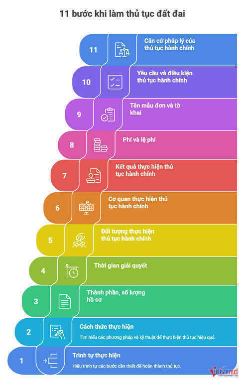 Theo đó, đã quy định về từng thủ tục đất đai cụ thể, gồm các bước: (1) Trình tự thực hiện; (2) Cách thức thực hiện; (3) Thành phần, số lượng hồ sơ; (4) Thời gian giải quyết; (5) Đối tượng thực hiện thủ tục hành chính; (6) Cơ quan thực hiện thủ tục hành chính; (7) Kết quả thực hiện thủ tục hành chính; (8) Phí, lệ phí; (9) Tên mẫu đơn, tờ khai; (10) Yêu cầu, điều kiện thực hiện thủ tục hành chính (nếu có); (11) Căn cứ pháp lý của thủ tục hành chính.