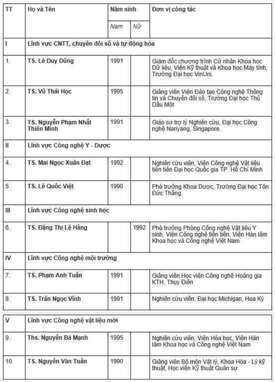 10 nhà khoa học trẻ xuất sắc nhất được vinh danh thuộc 5 lĩnh vực khoa học công nghệ chiến lược: Công nghệ thông tin, chuyển đổi số và tự động hóa, Công nghệ y – dược, Công nghệ sinh học, Công nghệ môi trường và Công nghệ vật liệu mới. Đây chính là nguồn nhân lực nòng cốt và lực lượng tiên phong thực hiện Nghị quyết 57.