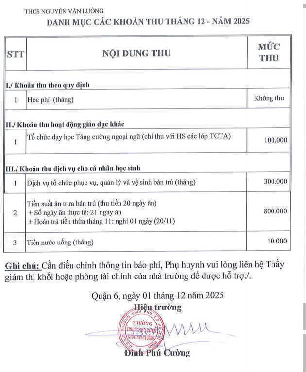Theo danh mục các khoản thu trong tháng 12/2025 của Trường THCS Nguyễn Văn Luông, phiếu báo tiền trường chỉ gồm 3 nhóm khoản thu rõ ràng, minh bạch.