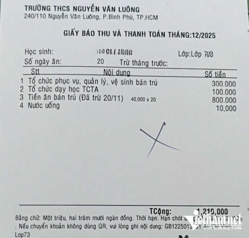 Trong khi đó, học sinh A.C.V, lớp 7/3, tham gia đầy đủ các dịch vụ bán trú và học tăng cường ngoại ngữ, nên tổng số tiền phải đóng trong tháng là 1.210.000 đồng, bao gồm 800.000 đồng tiền ăn trưa, 300.000 đồng phí phục vụ bán trú, 100.000 đồng học tăng cường ngoại ngữ và 10.000 đồng tiền nước uống.